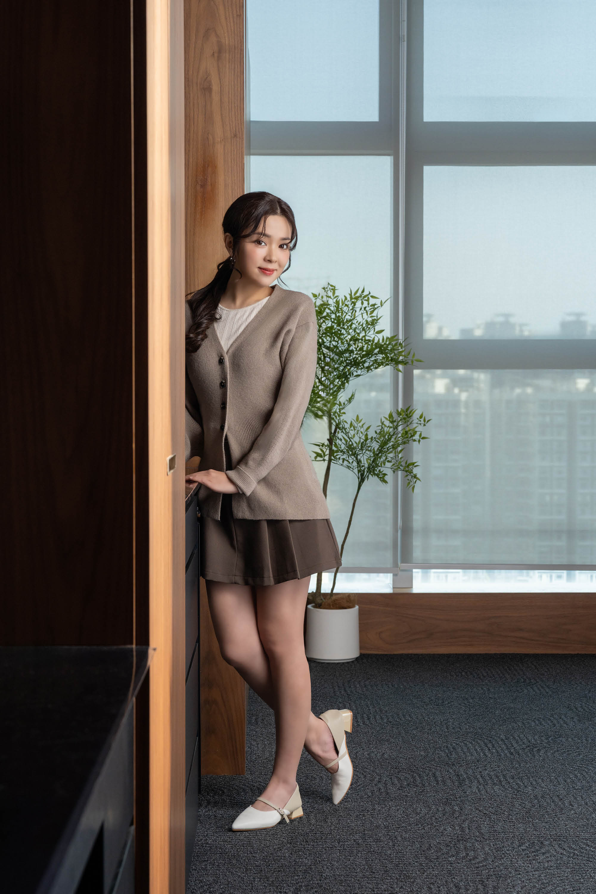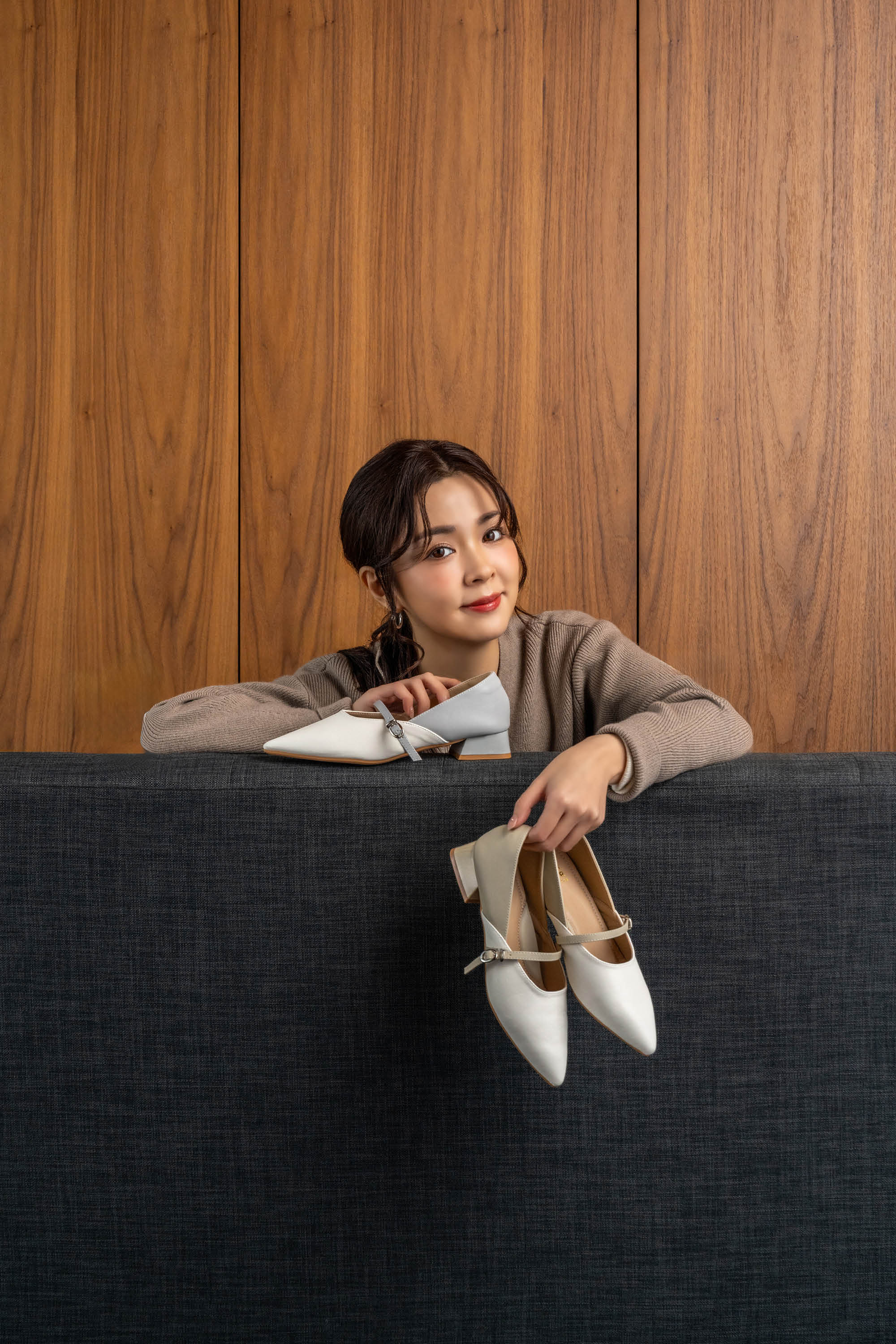 Within this minimalist intersection stands a young, refined office lady — the embodiment of poised sophistication. Her look completes with the Kross Stripe Flats, shoes that mirror the project’s theme through sleek lines and quiet confidence. Each contour, shadow, and stripe celebrates balance — between strength and softness, presence and grace.